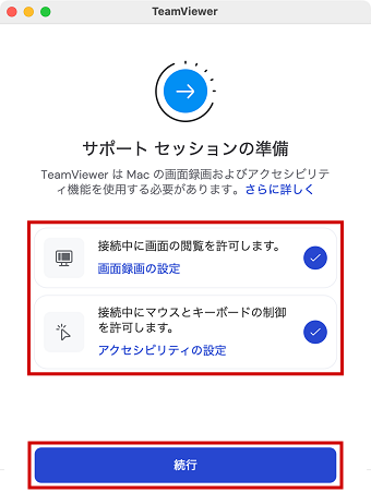 | 上図の画面が表示されたら2カ所にチェックを入れ、【続行】ボタンをクリックします。 |